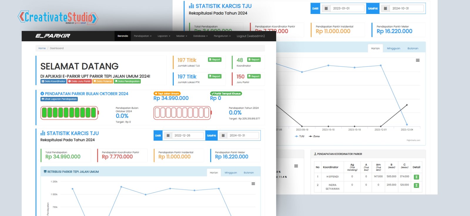 - Database Terintegrasi : Database Pendapatan terintegrasi dengan titik lokasi, pengawas region dan juru parkirnya.